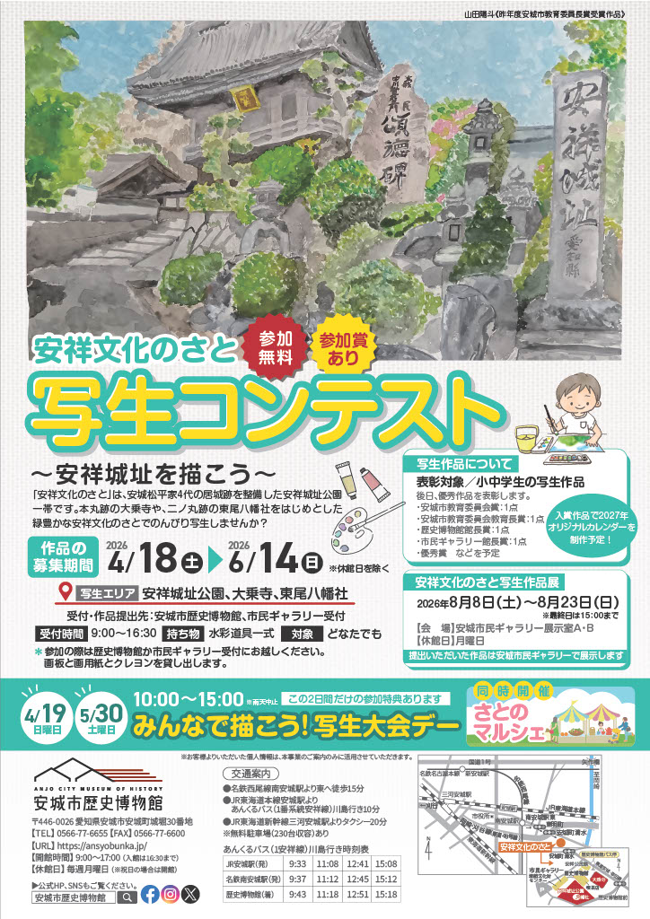「安祥文化のさと」は、安城松平家4代の居城跡を整備した安祥城址公園一帯です。本丸跡の大乗寺や、二ノ丸跡の東尾八幡社をはじめとした緑豊かな安祥文化のさとでのんびり写生しませんか?