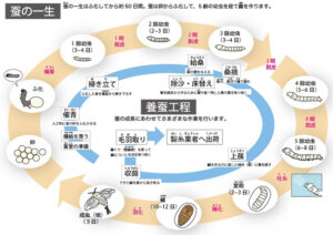 まず種紙をたね屋から購入し、卵からふ化させます。掃き立てをして、円座の上で給桑をします。また蚕が病気にならないように床替えをしました。ふ化してから一週間ほどで初眠に入り、脱皮します。蚕は眠や脱皮を繰り返し、1齢から5齢へと成長してゆきます。